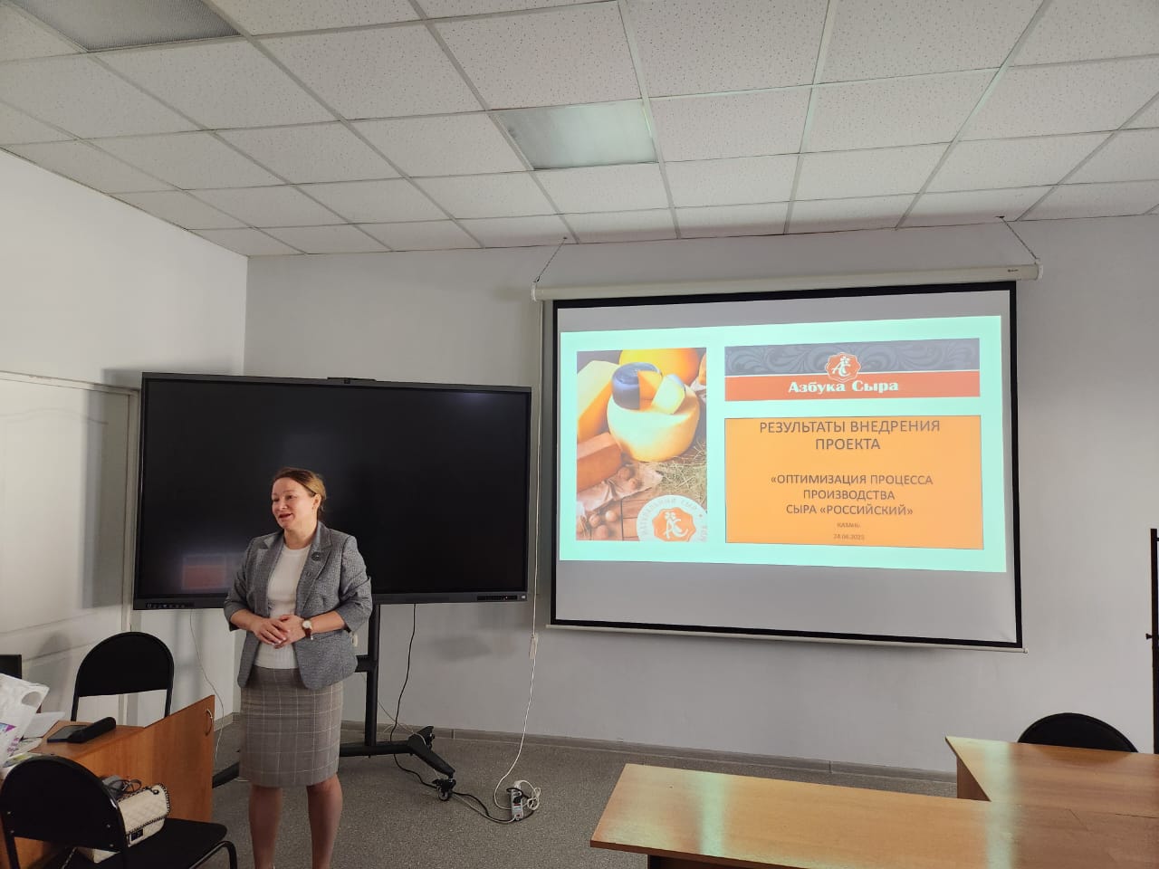 Исполнительный директор ООО «Азбука сыра» Виктория Галаутдинова рассказала ребятам об истории развития предприятия, иновациях в технологии и особенностях региональной практики производства сыра. Ребята задавали вопросы о факторах, влияющих на процесс ценообразования и конкурентоспособности сыров в Российской Федерации.